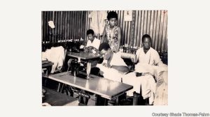 Shade Thomas ta na aikin kammala wata sutura.